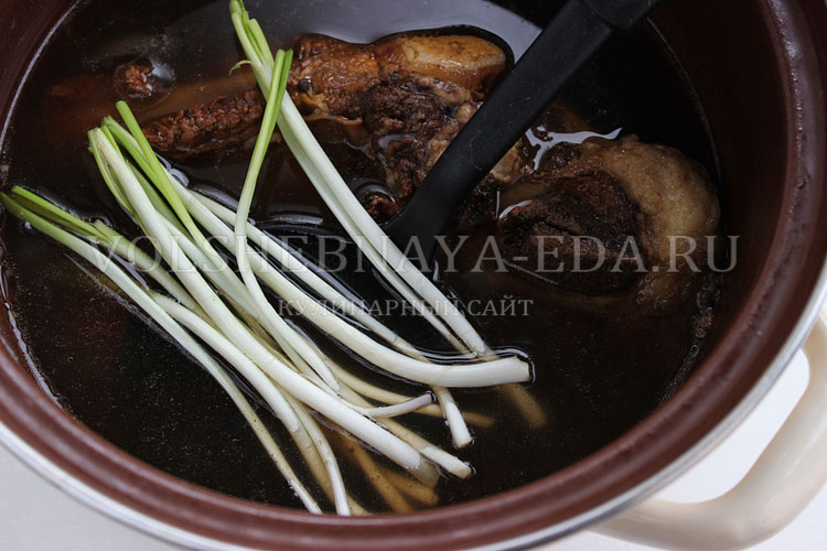Когда отвар станет насыщенным и ароматным, в него добавляют нарезанный белый лук-перо и варят всего несколько секунд, чтобы он сохранил хруст. После этого его вынимают и откладывают. Мясо отделяют от костей, кости выбрасывают, а говядину нарезают на небольшие кусочки, удобные для подачи. Сам бульон процеживают, чтобы убрать остатки специй и сделать его идеально чистым.