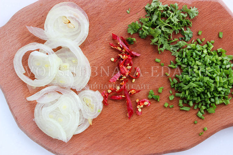 Репчатый лук очищают и нарезают полупрозрачными кольцами. Если он слишком острый, можно ненадолго замочить его в холодной воде. Острый перец нарезают тонкими кружками, а зеленый лук, кинзу или петрушку мелко рубят ножом.