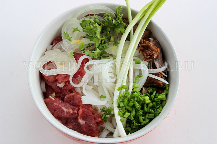 В глубокую миску или пиалу кладут небольшую горку лапши, сверху добавляют кусочки варёной говядины и несколько ломтиков свежего мяса. Затем раскладывают кольца лука и посыпают все зеленью.